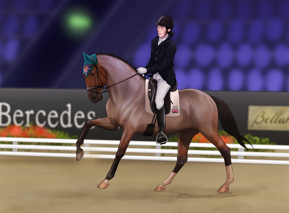 "Huolellinen linetys, selkeä värimaailma ja tasapainoinen väripaletti tuovat hahmot elävästi esille, ja taustan tummat sävyt ja epätarkkuus luovat visuaalisesti tyylikkään kontrastin sekä ohjaavat huomion kuvan keskiössä olevaan ratsukkoon. Hevosella ryhdikäs asento ja täsmällinen askellus; kyseessä selkeästi taidokas ratsu ja korkean tason koulukilpailut. Kokonaisuutena kuva heijastaa arvokasta ja kilpailuhenkistä tunnelmaa."